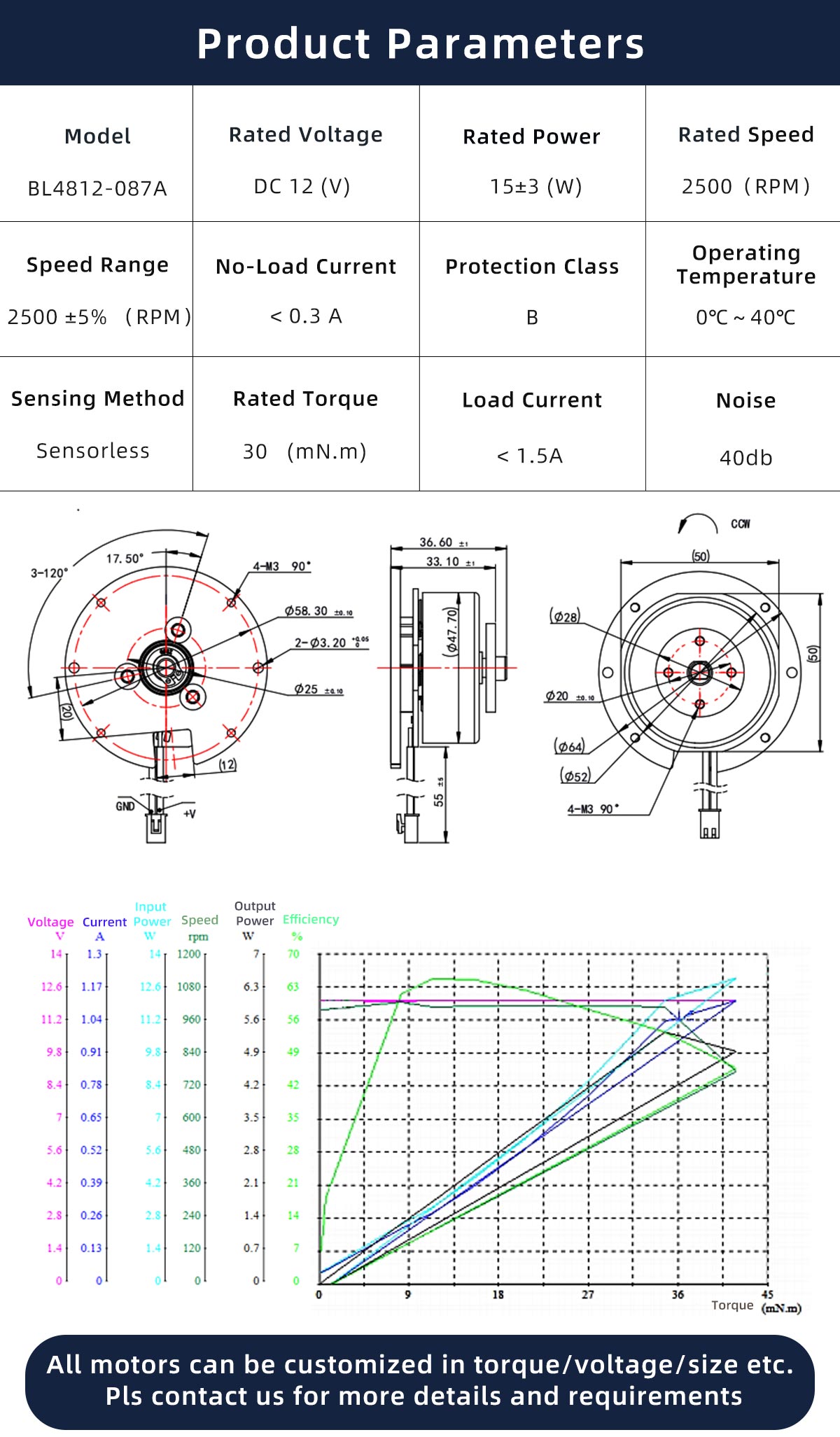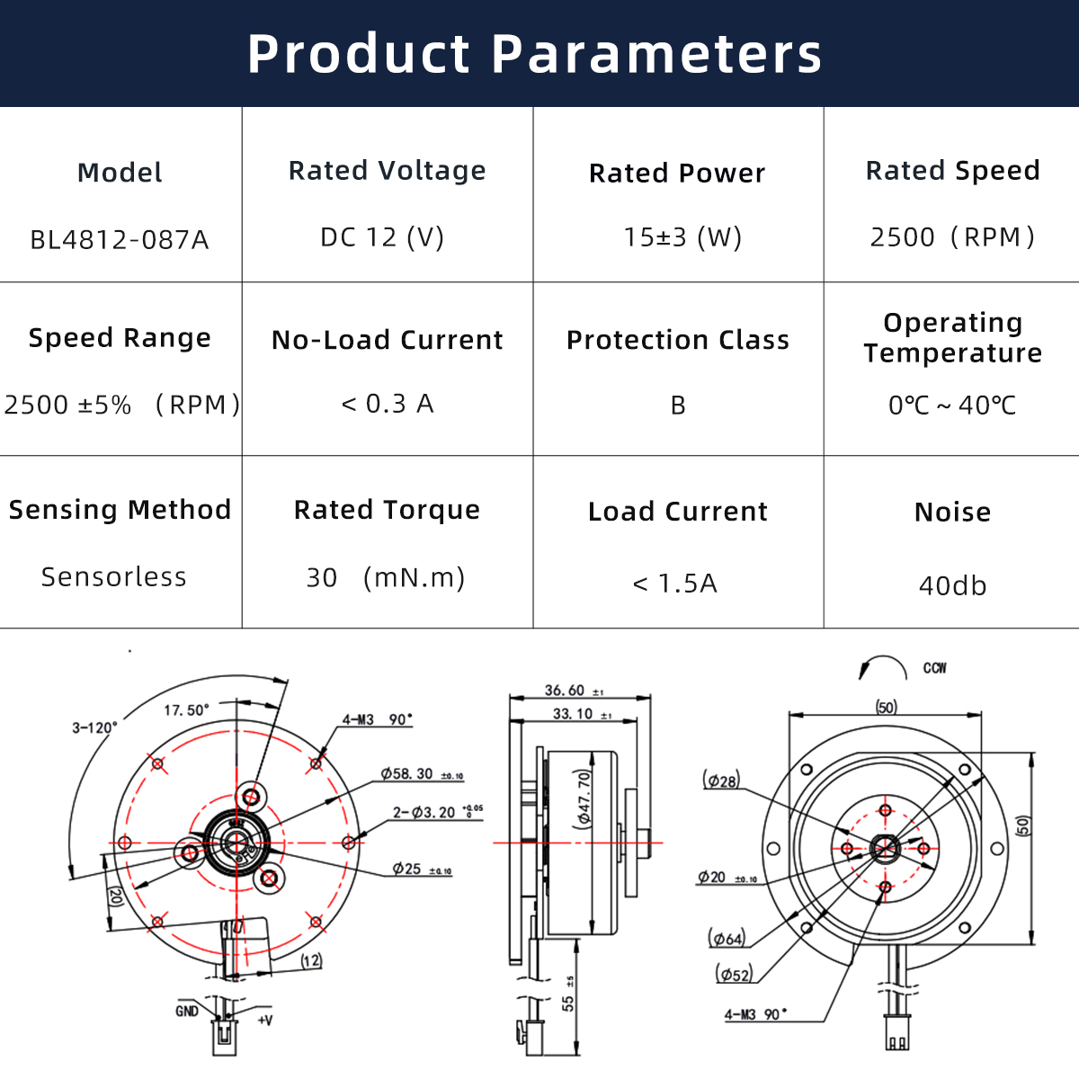 Brushless DC Motor BL4812-087A is engineered for compact motion systems requiring efficient power delivery, stable high-speed operation, and low acoustic noise. The motor adopts a 3-phase brushless architecture with sensorless drive, ensuring smooth commutation and reduced system complexity.
