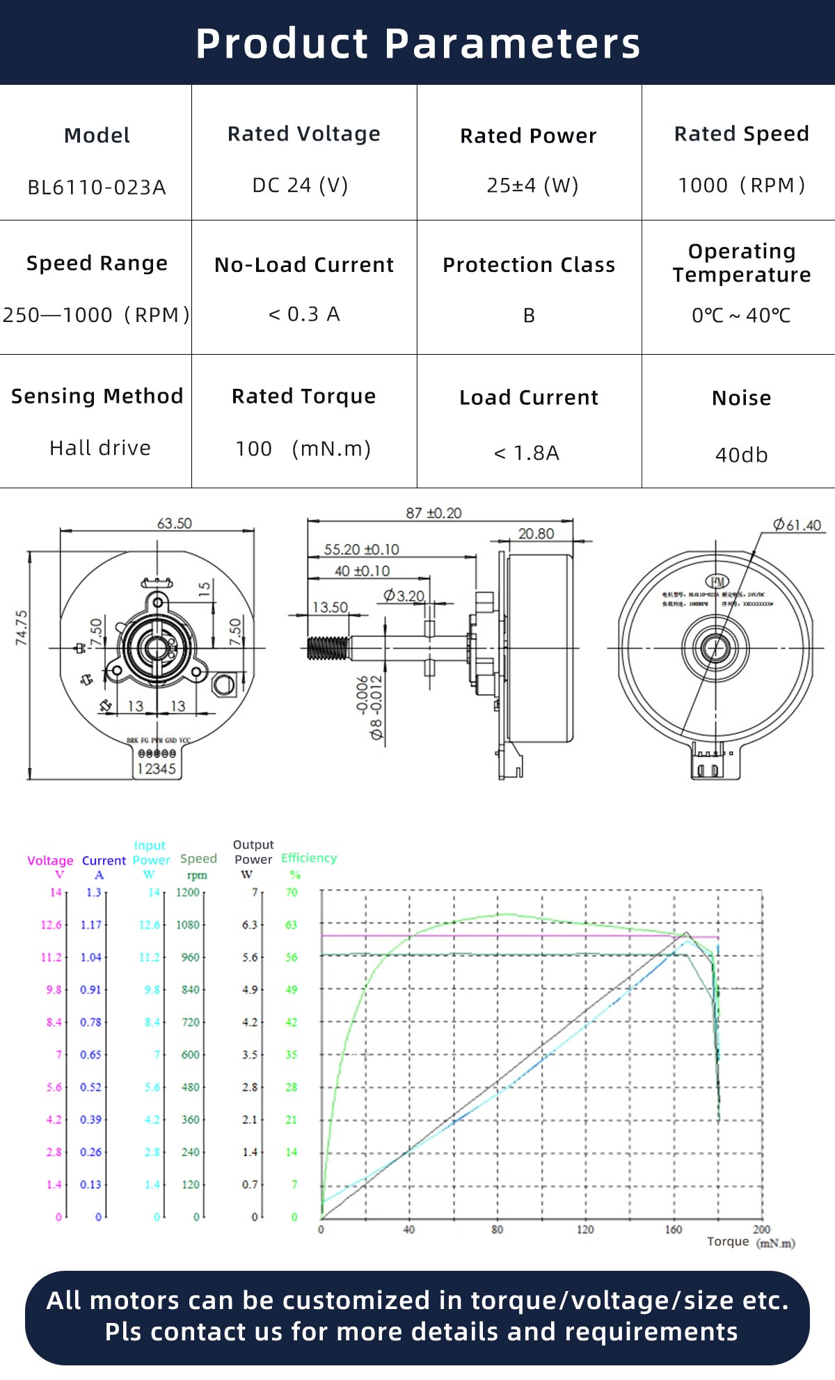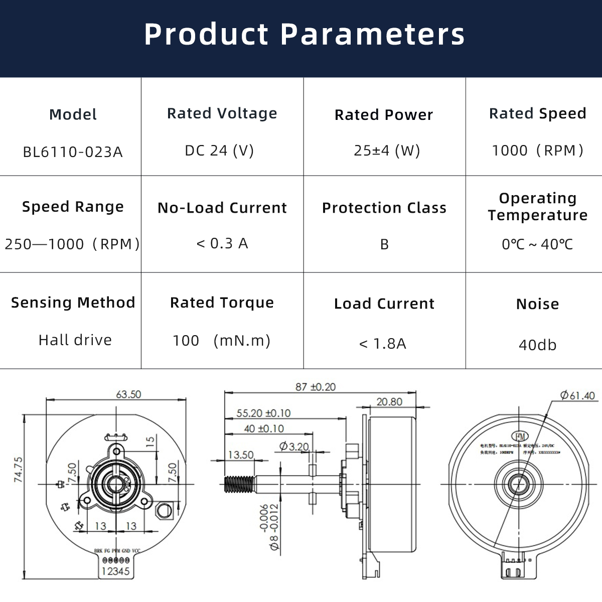 Brushless DC Motor BL6110N-023A is engineered for compact motion systems requiring high torque density, smooth commutation, and reliable low-speed speed regulation. The motor adopts a 3-phase brushless architecture with Hall-effect sensing, ensuring precise commutation and stable torque output under varying load conditions.