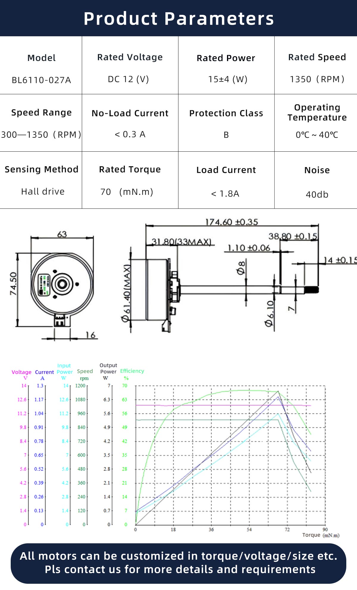 The BL6110N-027A is a brushless DC motor delivering 70 mN·m rated torque at 1350 RPM, operating at 12 VDC, designed for smooth, low-noise operation with precise low-voltage speed control.