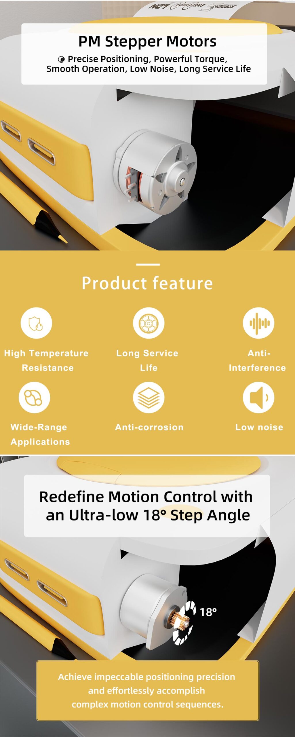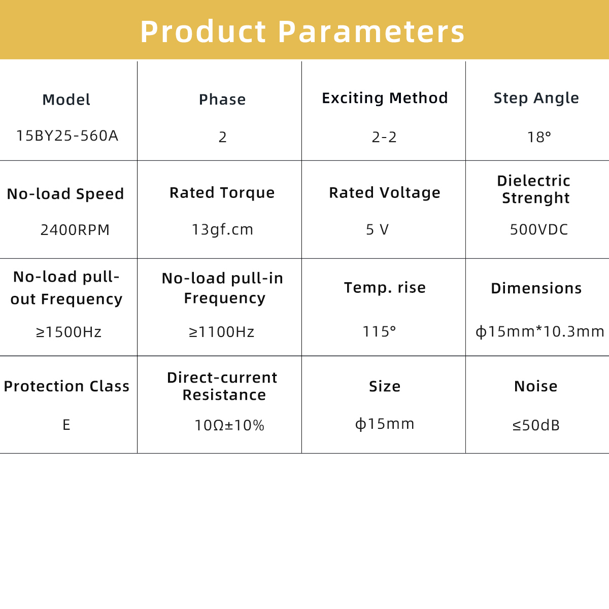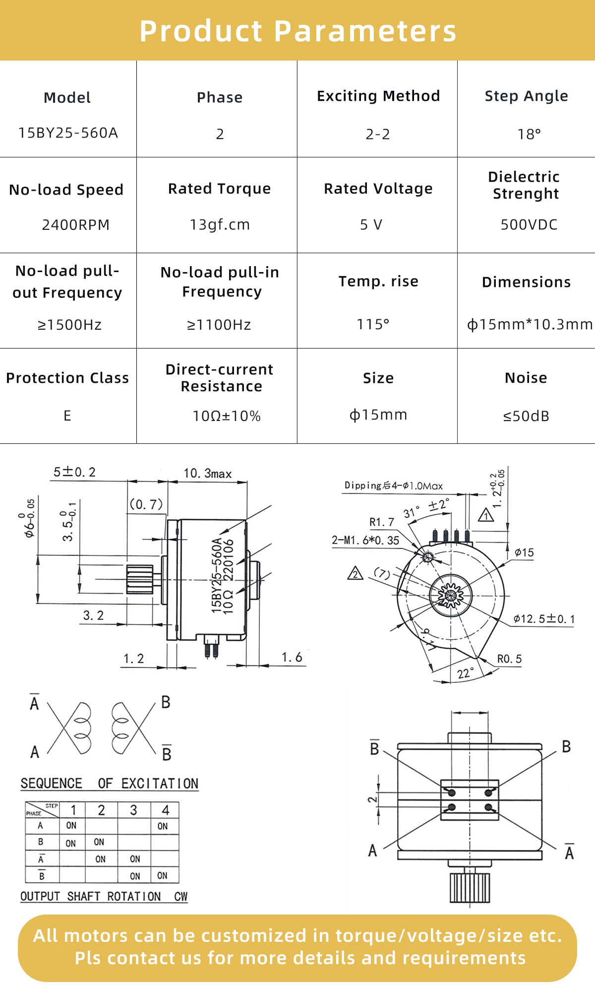 BY PM Stepper Motor 15BY25-560A is engineered for applications requiring compact size, moderate torque, and high-speed operation at low voltage. The motor adopts a 2-phase permanent magnet structure with a 2–2 exciting method and an 18° step angle, providing efficient stepping behavior and simple control.