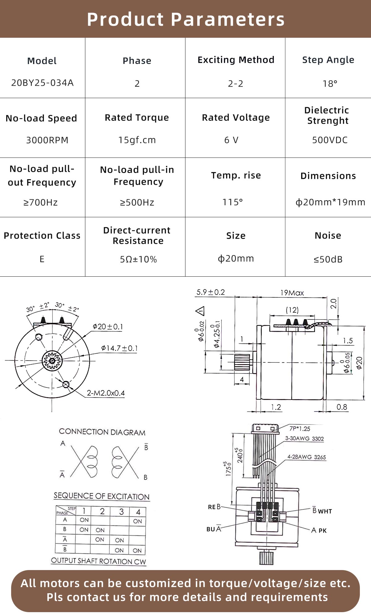 BY PM Stepper Motor 20BY25-034A is engineered for applications requiring compact size, moderate torque, and high-speed operation. The motor adopts a 2-phase permanent magnet structure with a 2–2 exciting method and an 18° step angle, delivering efficient stepping performance and straightforward control.