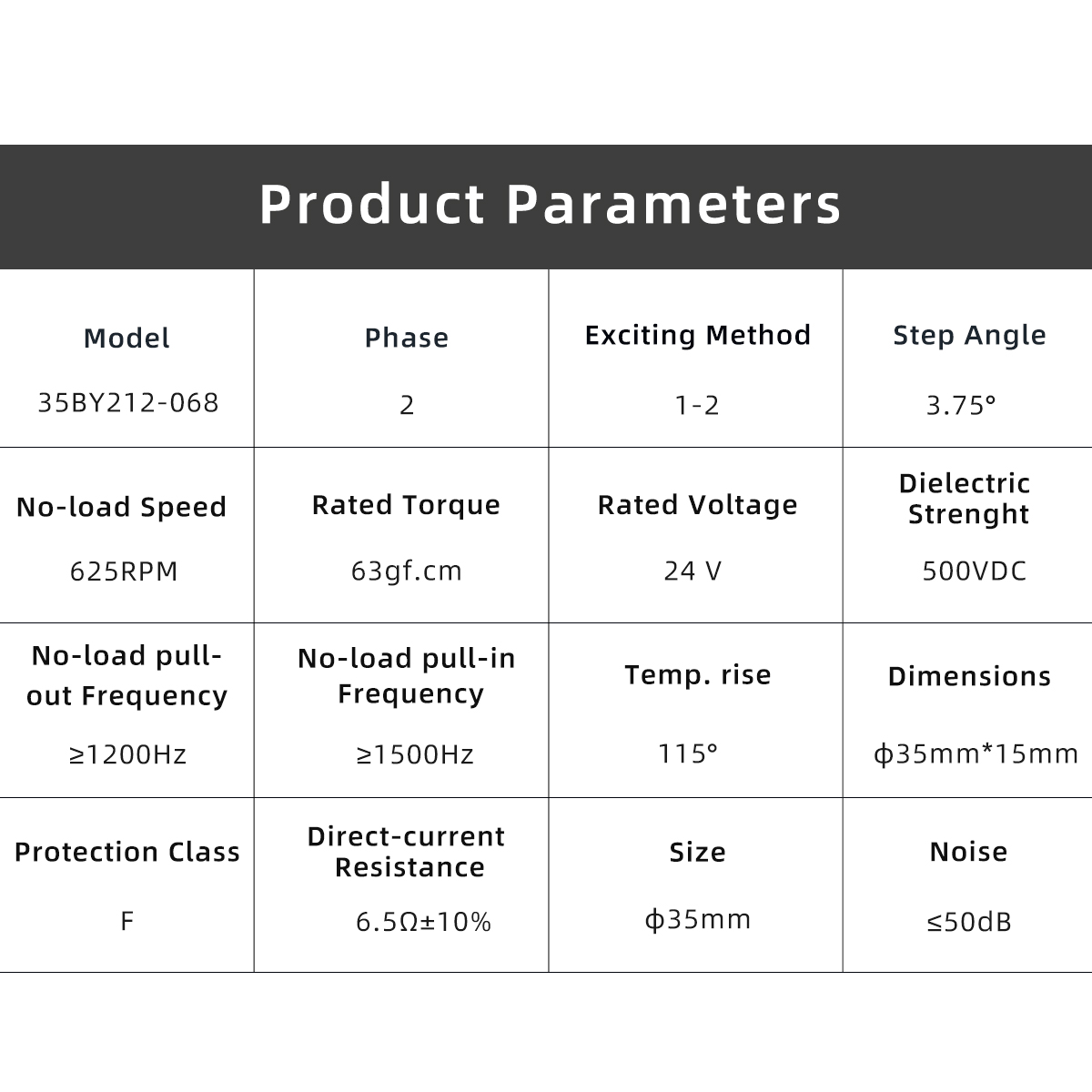 The 35BY212-068 is a precision BY PM stepper motor delivering 63 gf·cm rated torque with a fine 3.75° step angle, operating at 24 VDC, designed for compact positioning applications requiring higher resolution and fast stepping response.