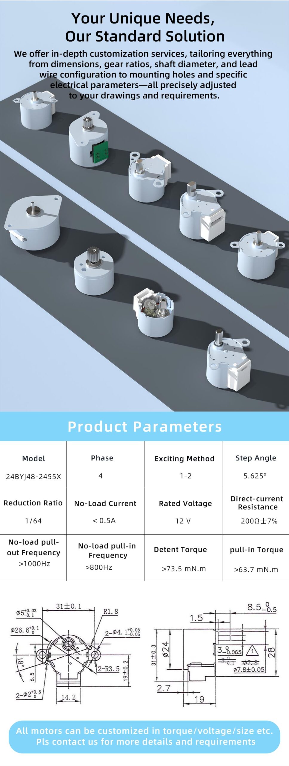 The 24BYJ48-2455X is a compact BYJ stepper motor featuring a 1/64 gear reduction and 5.625° step angle, operating at 12 VDC, designed for low-speed, high-precision positioning applications requiring quiet operation and long service life.