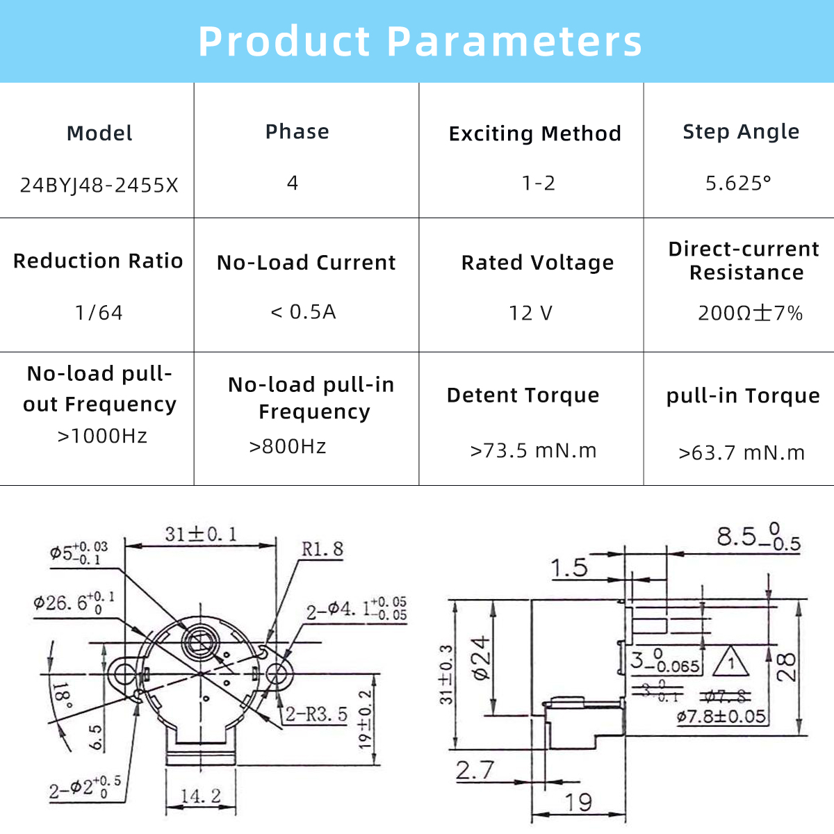 BYJ Stepper Motor 24BYJ48-2455X is engineered for applications requiring accurate step positioning, smooth low-speed operation, and compact mechanical integration. The motor adopts a 4-phase, 1–2 exciting method and a 5.625° step angle, paired with a 1/64 reduction gearbox to significantly increase output torque and positioning resolution.