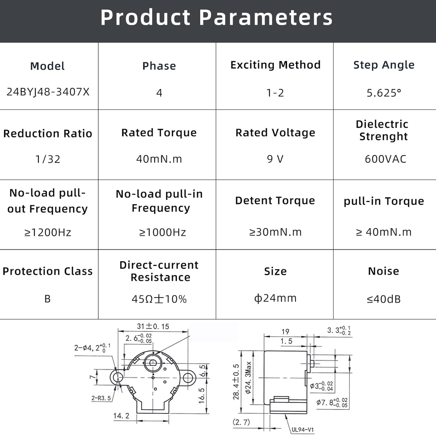 The 24BYJ48-3407X is a compact BYJ stepper motor featuring a 1/32 gear reduction and 5.625° step angle, operating at 9 VDC, designed for low-speed positioning applications requiring higher response frequency and quiet operation.