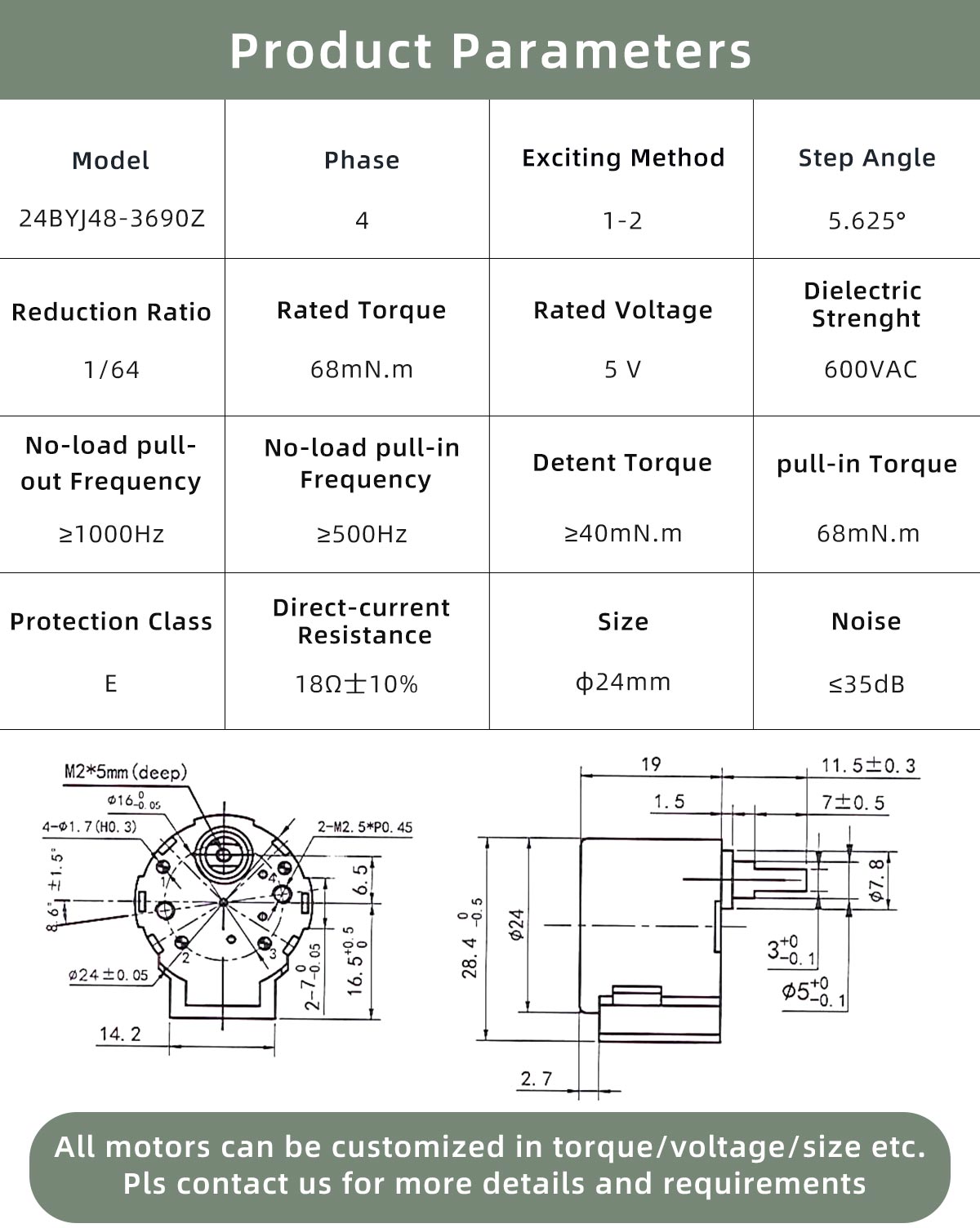 The 24BYJ48-3690Z is a compact BYJ stepper motor with a 1/64 gear reduction and 5.625° step angle, operating at 5 VDC, designed for low-speed, high-precision positioning applications requiring quiet operation and stable torque output.