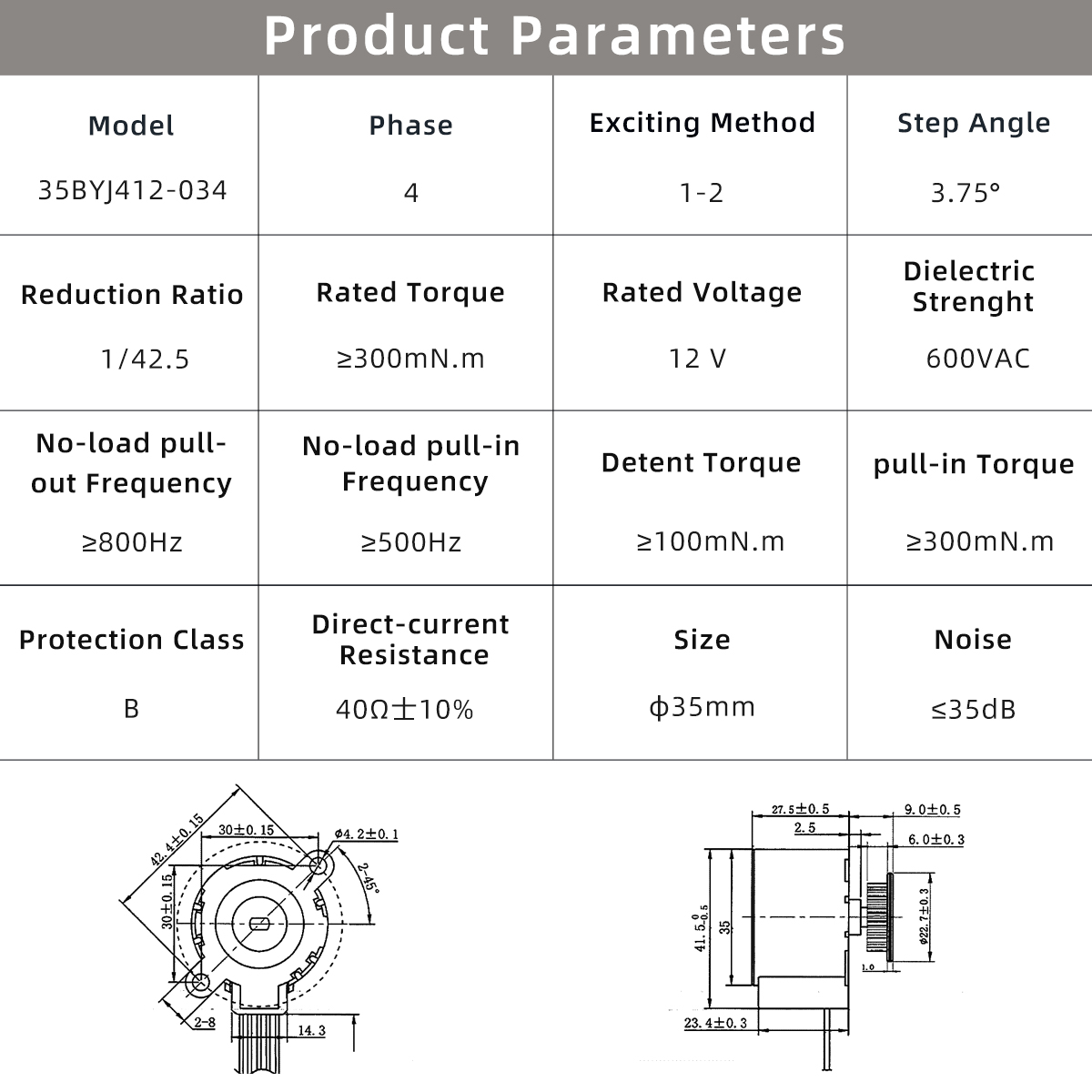 The 35BYJ412-034 is a high-torque BYJ stepper motor with a 1/42.5 gear reduction and 3.75° step angle, operating at 12 VDC, designed for low-speed, high-load positioning applications requiring high resolution and stable torque output.