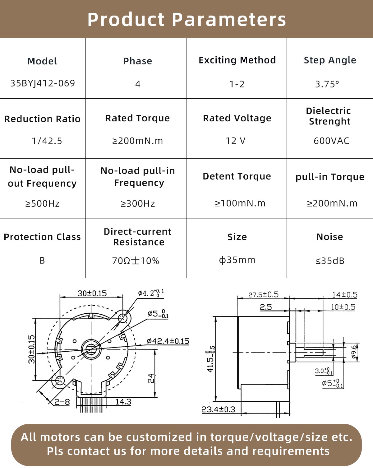 The 35BYJ412-069 is a high-torque BYJ stepper motor with a 1/42.5 gear reduction and 3.75° step angle, operating at 12 VDC, designed for low-speed positioning applications requiring stable torque output, smooth operation, and long service life.