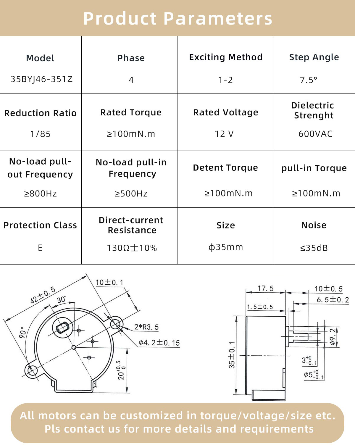 The 35BYJ46-351Z is a high-torque BYJ stepper motor with a 1/85 gear reduction and 7.5° step angle, operating at 12 VDC, designed for low-speed positioning applications requiring stable torque output, quiet operation, and compact integration.