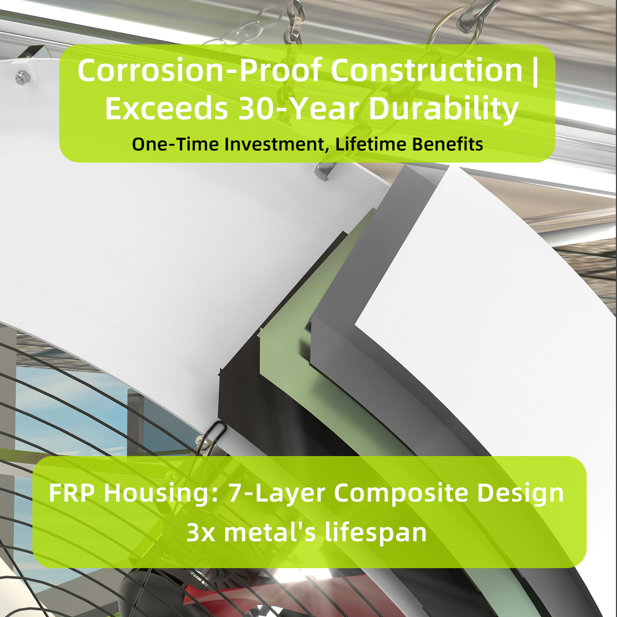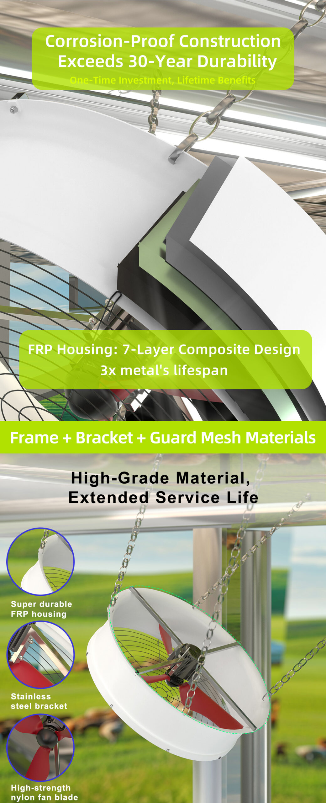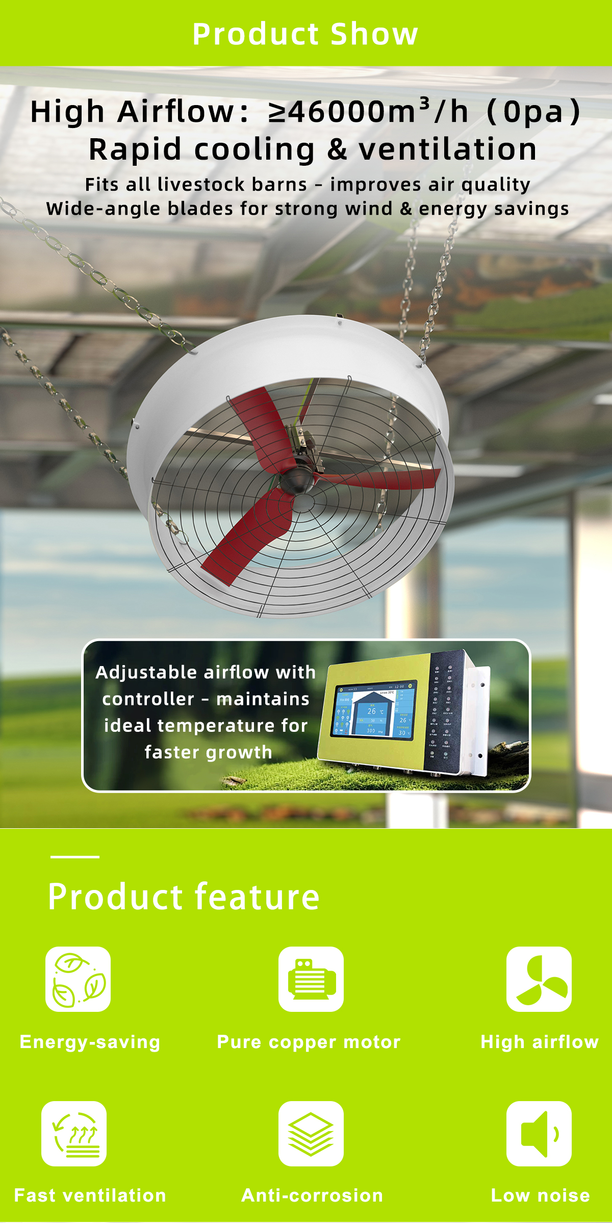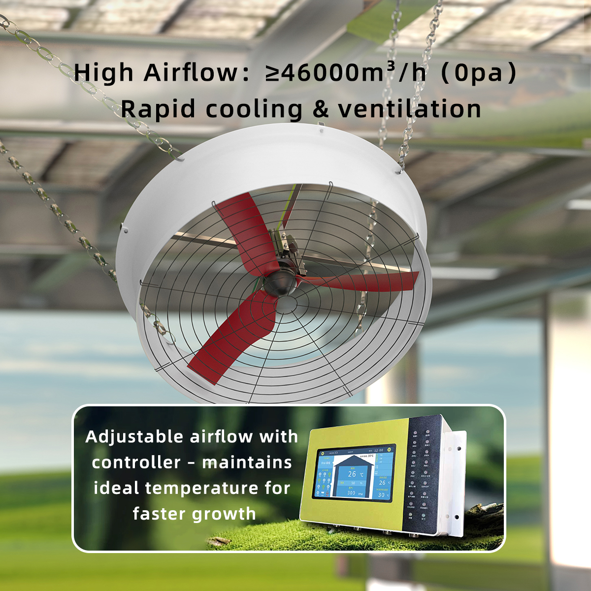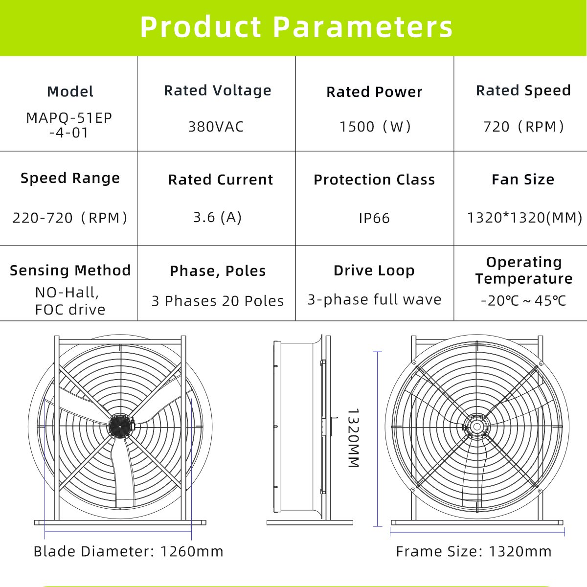 With a 1320 × 1320 mm fan size, the MAPQ-51EP-4-01 is ideal for integrated exhaust systems, airflow management modules, and ventilation solutions used in industrial facilities and smart agricultural environments.