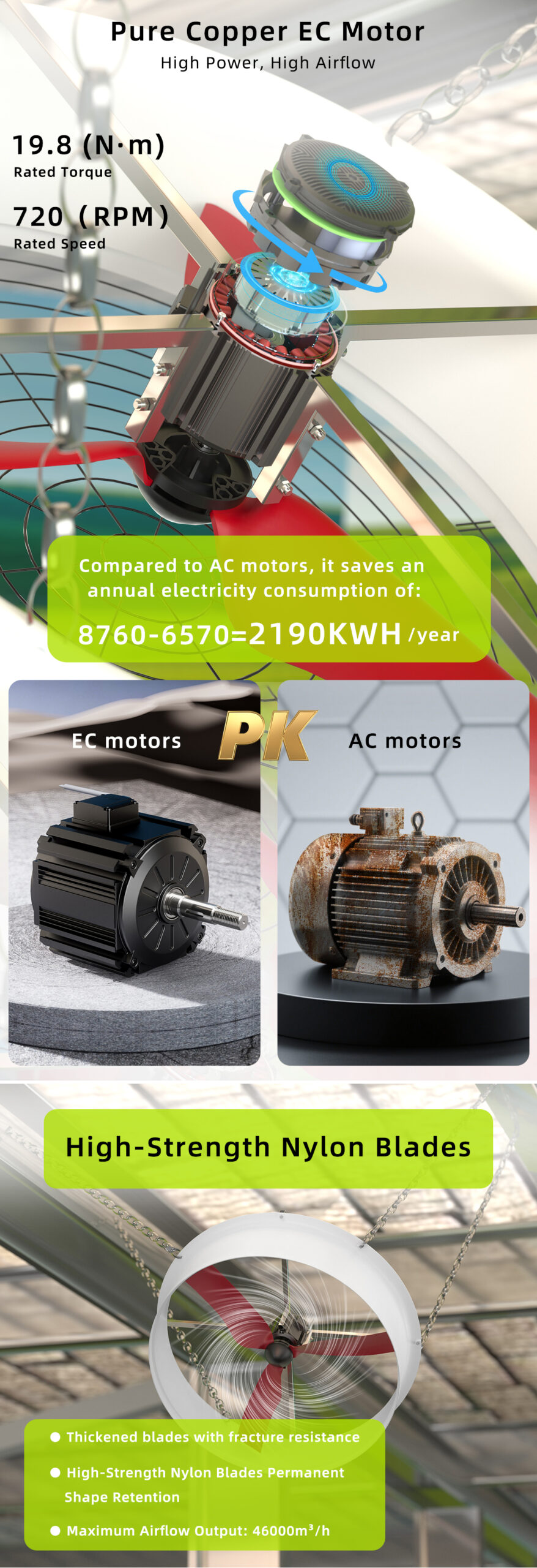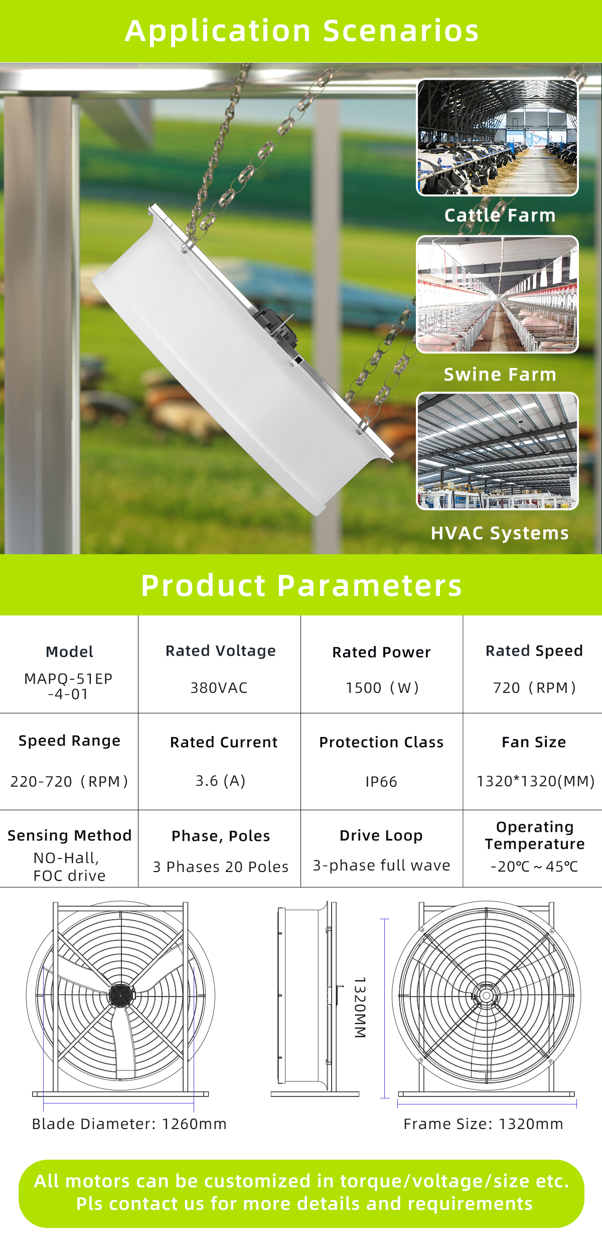 The MAPQ-51EP-4-01 is an EC fan system delivering adjustable airflow from 220 to 720 RPM with 1.5 kW rated power, operating at 380 VAC, designed for industrial and agricultural ventilation applications requiring efficient, stable, and continuous operation.