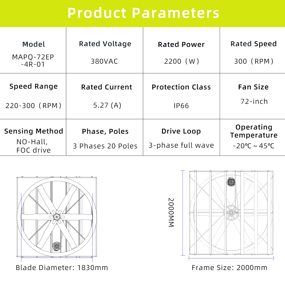 With a 2000 × 2000 mm fan size, the MAPQ-72EP-4R-01 is well suited for integrated ventilation systems, large-area exhaust solutions, and airflow management modules used in industrial facilities and smart agricultural environments.