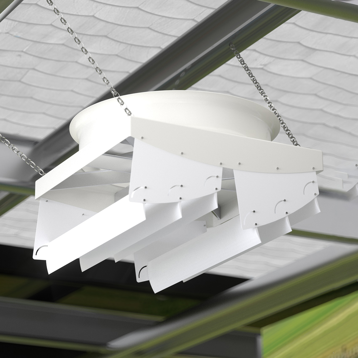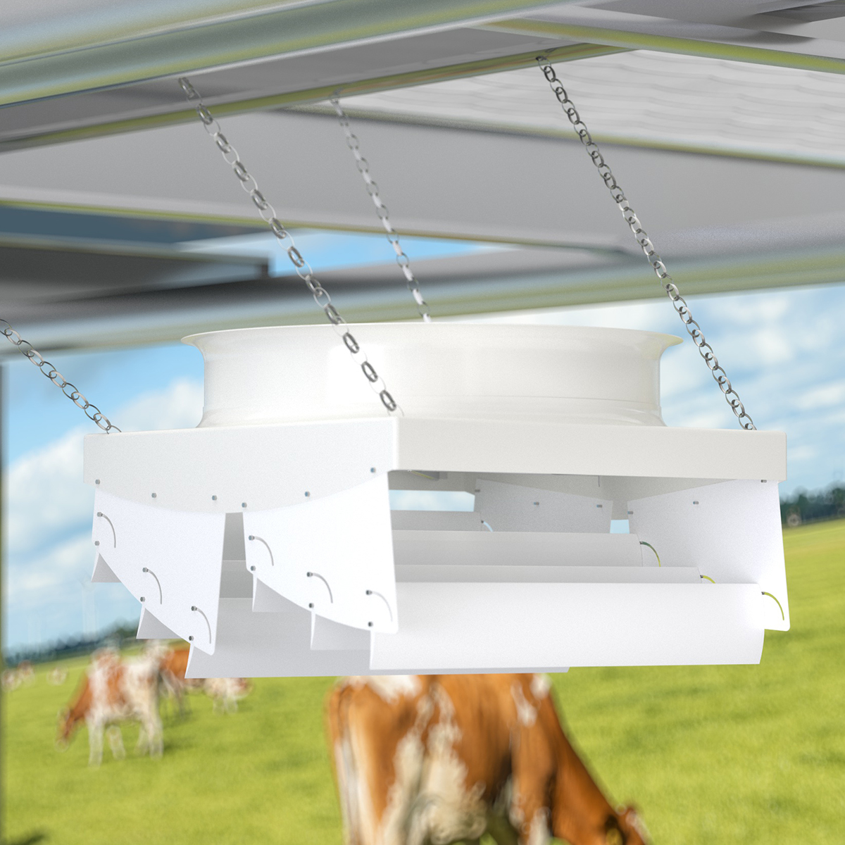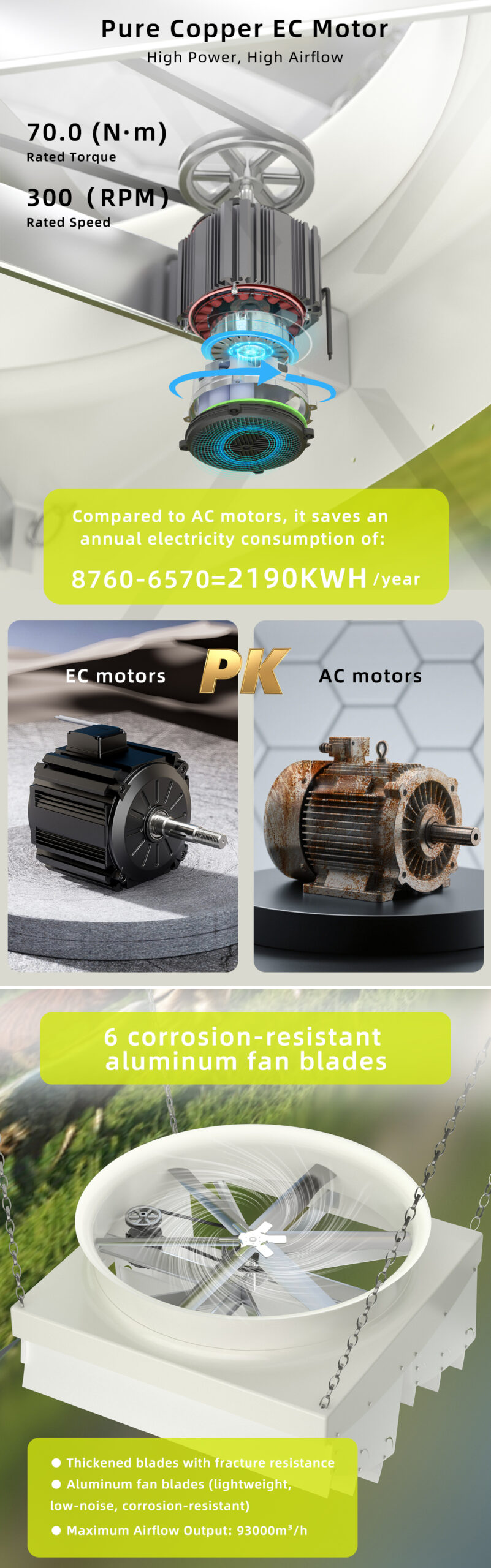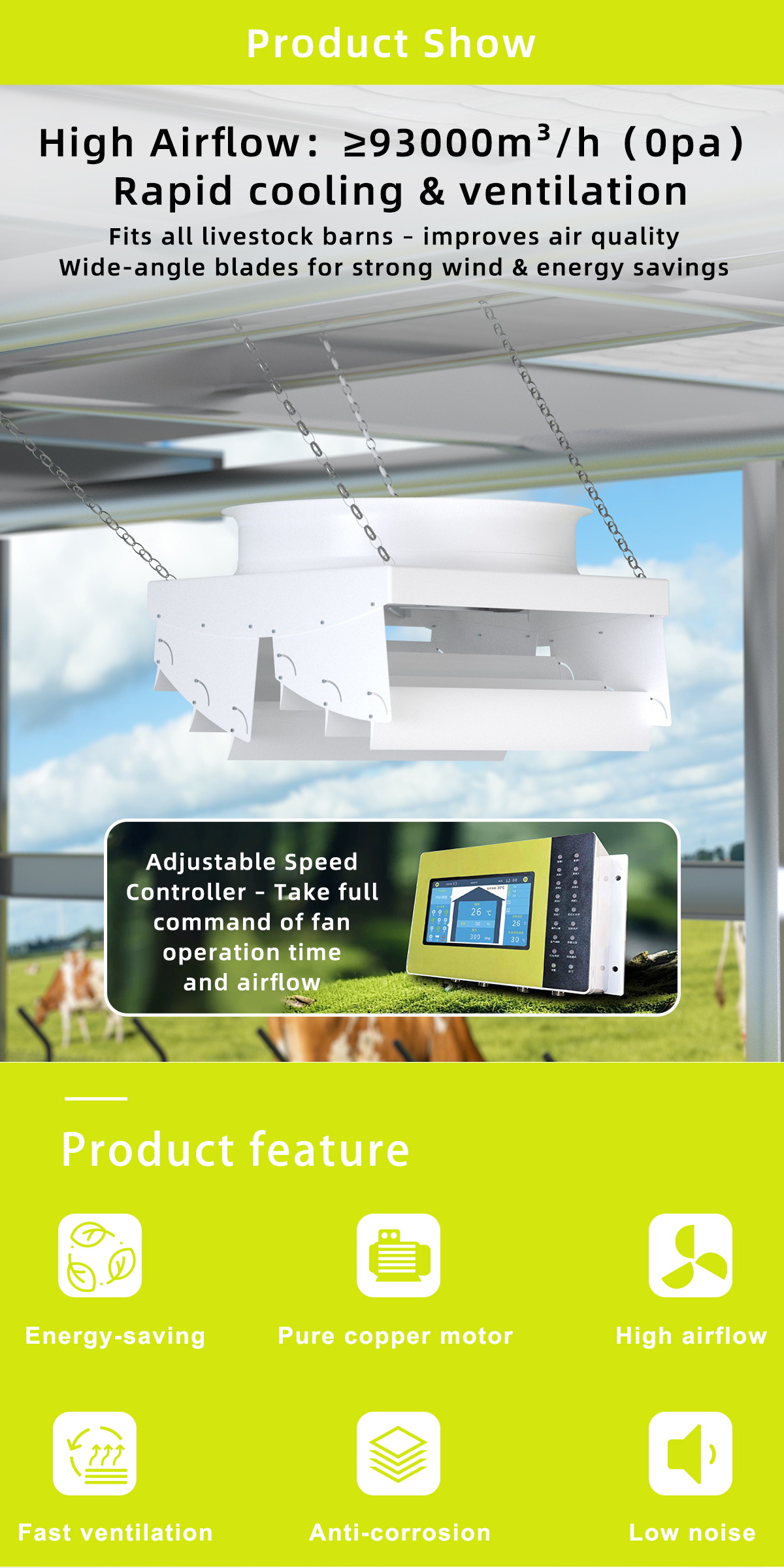 The MAPQ-72EP-4R-01 is a large-format EC fan system delivering high-volume airflow at ultra-low speeds from 220 to 300 RPM with 2.2 kW rated power, operating at 380 VAC, designed for industrial and agricultural ventilation applications requiring gentle, uniform air movement over large areas.