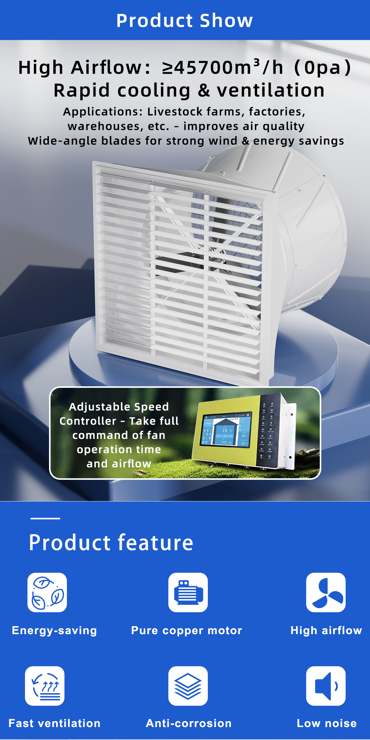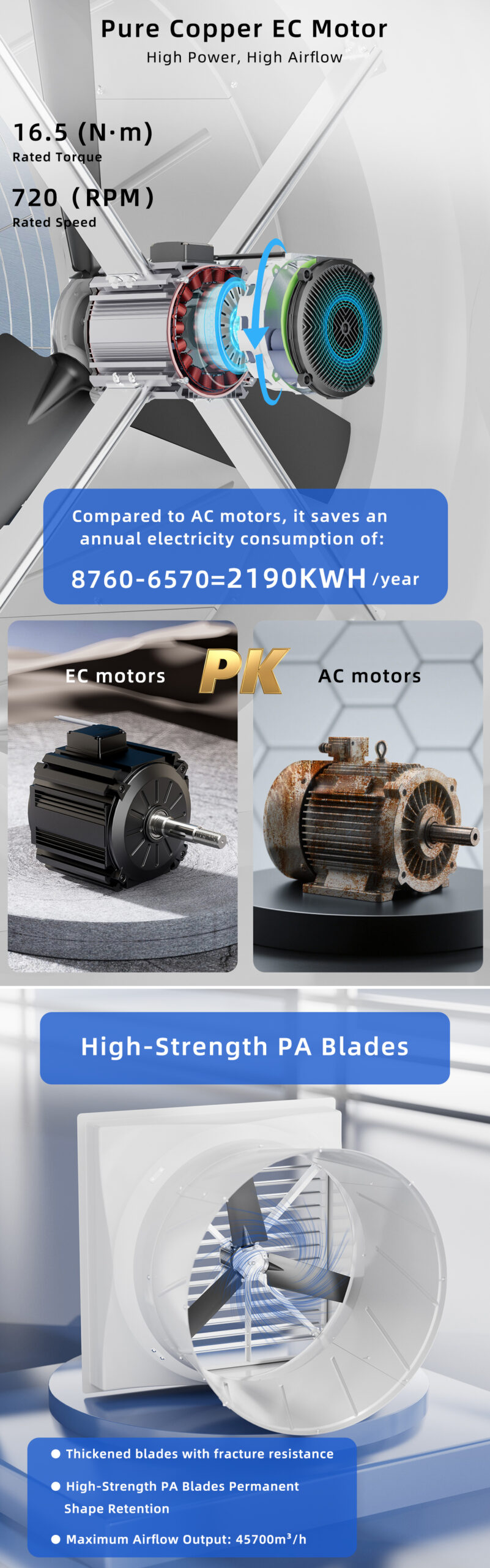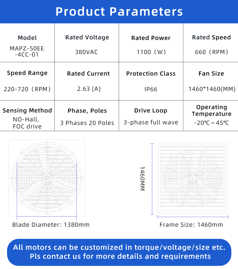 With a 1460 × 1460 mm fan size, the MAPZ-50EE-4CC-01 is ideal for integrated ventilation modules, exhaust systems, and airflow management solutions used in industrial facilities and smart agricultural environments.