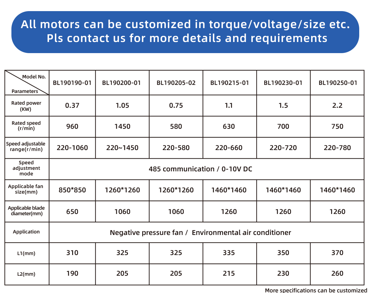 The BL190205-02 is ideal for EC fan drives, exhaust systems, and other industrial or agricultural equipment that require strong torque, smooth operation, and environmental durability.