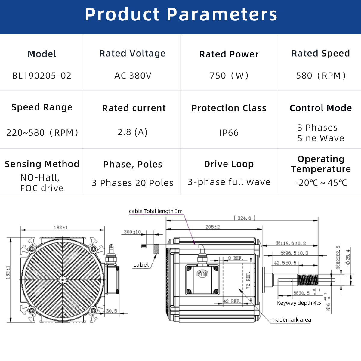 The BL190205-02 is a high-torque EC motor delivering adjustable speed from 220 to 580 RPM with 750 W rated power and 10 N·m torque, operating at 380 VAC, designed for industrial and agricultural exhaust applications requiring stable low-speed performance and reliable continuous operation.