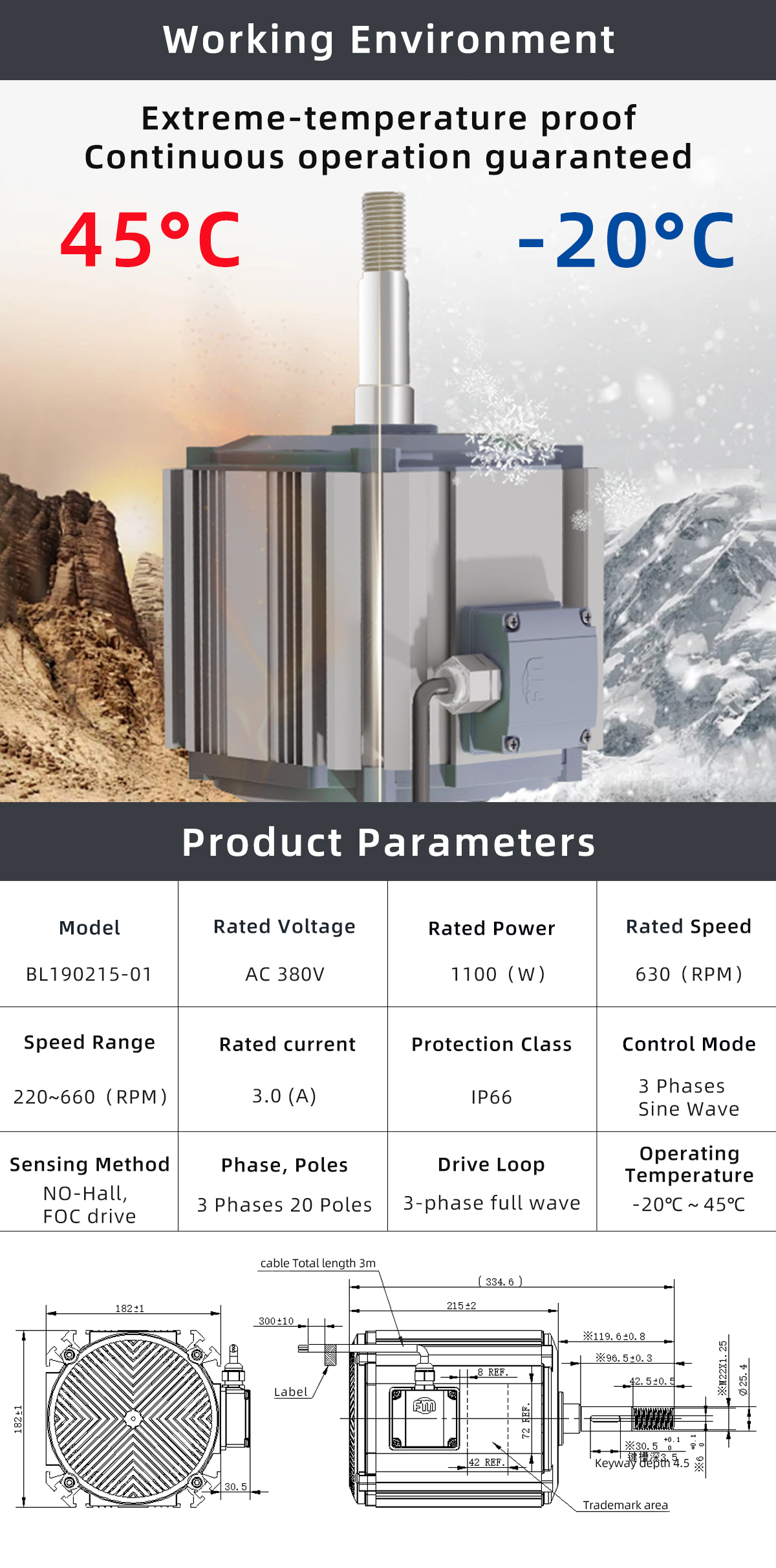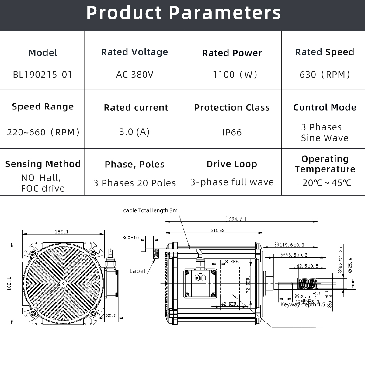 EC Motor BL190215-01 is engineered for applications requiring strong torque at low-to-medium operating speeds, precise speed regulation, and long-term operational reliability. Powered at 380 VAC, it operates at a rated speed of 630 RPM with an adjustable speed range from 220 to 660 RPM, delivering 1100 W rated power while maintaining 13 N·m output torque.