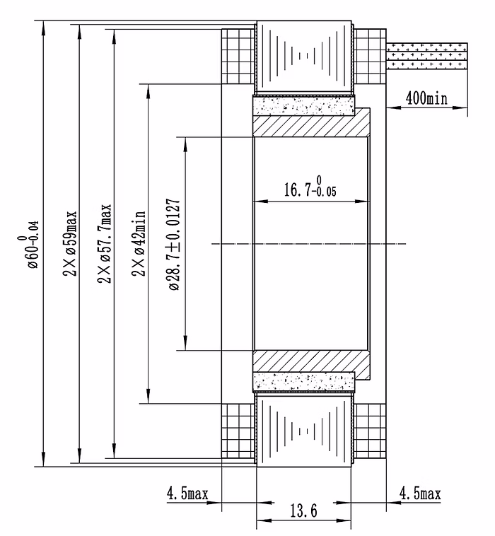 The outline drawing provides the complete mechanical dimensions and installation interfaces for this product. It includes key measurements such as outer diameter, mounting points, shaft or bore sizes, tolerances, and required clearances to ensure correct fitment. These dimensions support accurate system design, housing layout, and seamless integration into a wide range of mechanical assemblies.Frameless-Torque-Motor-60LW01-Outline